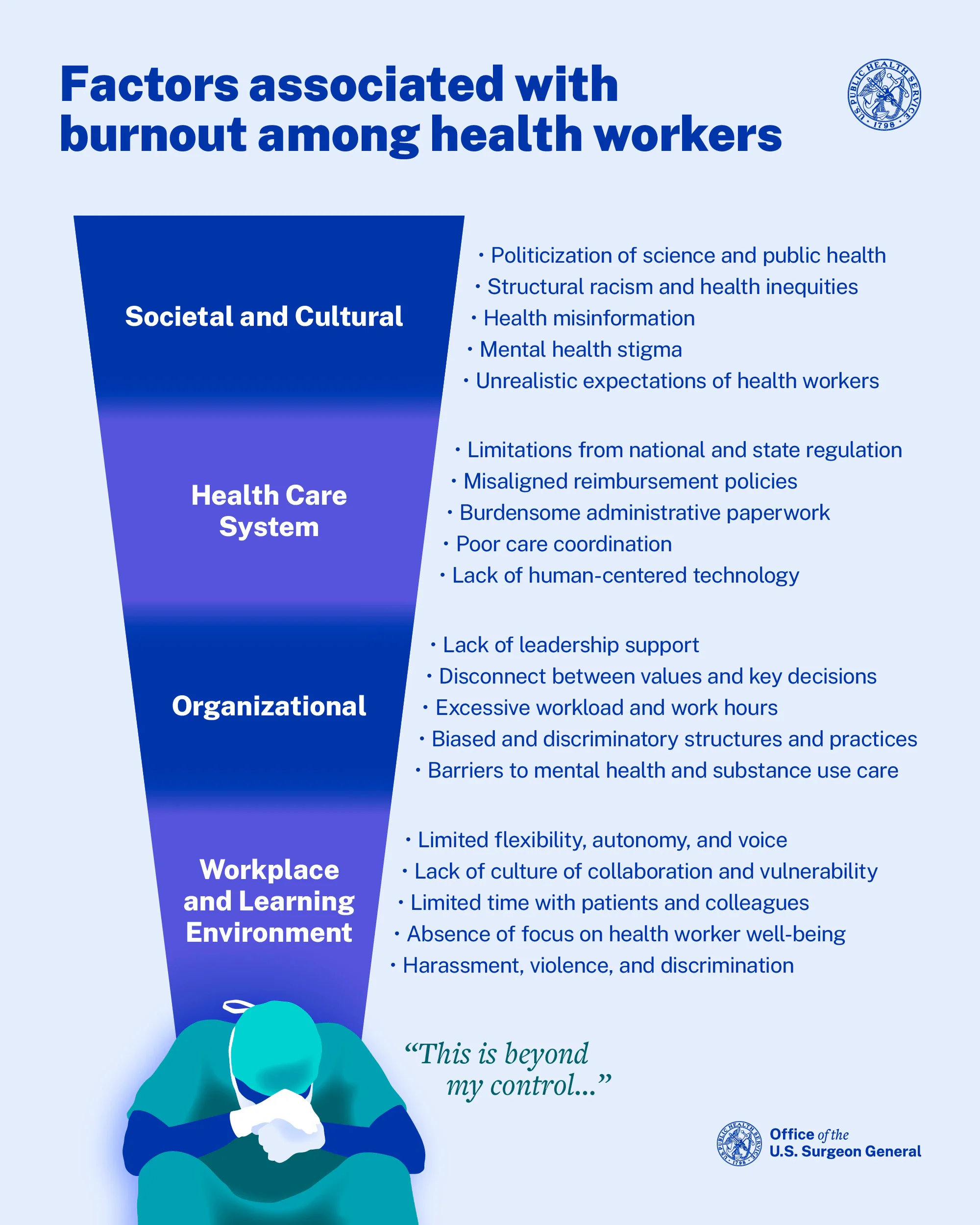 This infographic from the US Surgeon General’s Advisory on Byuilding a Thriving Health Workforce eloquently illustrates factors impacting burnout.